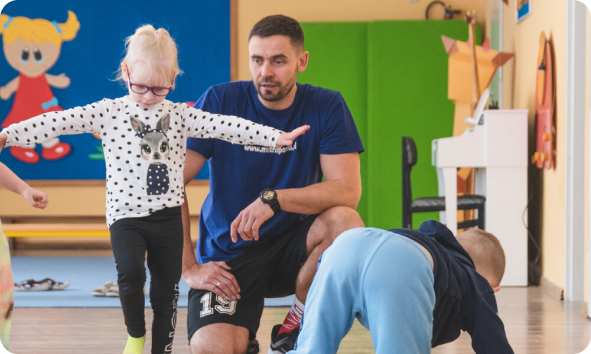 Ćwiczenia prowadzone są w formie angażujących gier i aktywności, które zachęcają dzieci do ruchu i współpracy. Dzięki temu dzieci uczą się nowych umiejętności w przyjaznym i motywującym środowisku.